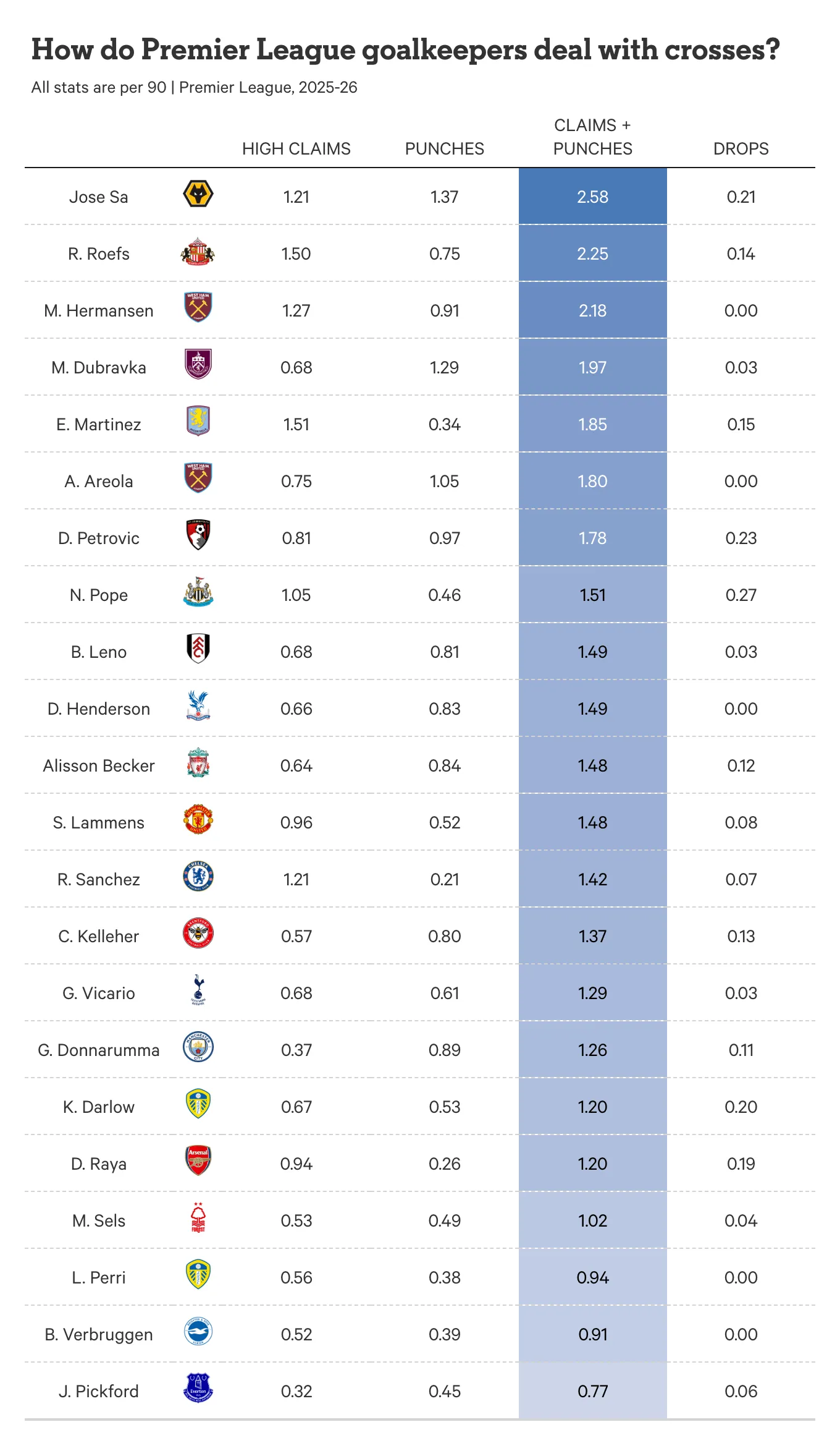 在击球方面,数据最高的是狼队门将若泽-萨(1.37次),伯恩利的杜布拉夫卡(1.29次),西汉姆的阿雷奥拉(1.05次),其余17位主力门将平均90分钟均没有再上1次的数据。